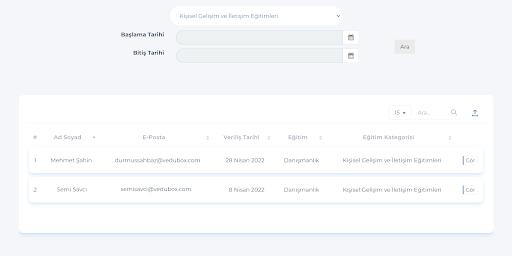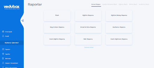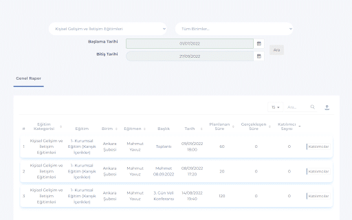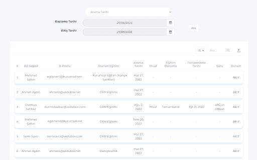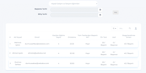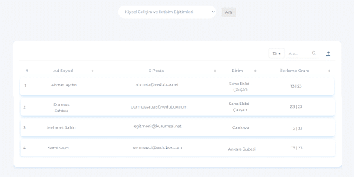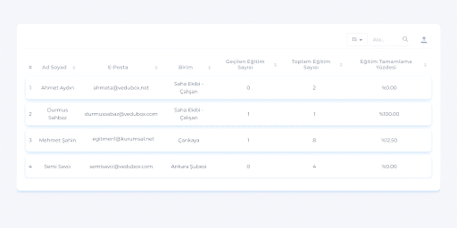 Eğitim Raporu: Sistemdeki her kullanıcının kayıtlı olduğu ve tamamladığı eğitim sayısı ile ilgili bilgi verir. Eğitim tamamlama yüzdesine göre öğrencileri sıralamanıza izin vererek tüm öğrencilerin genel durumunu kıyaslamanızı sağlar.